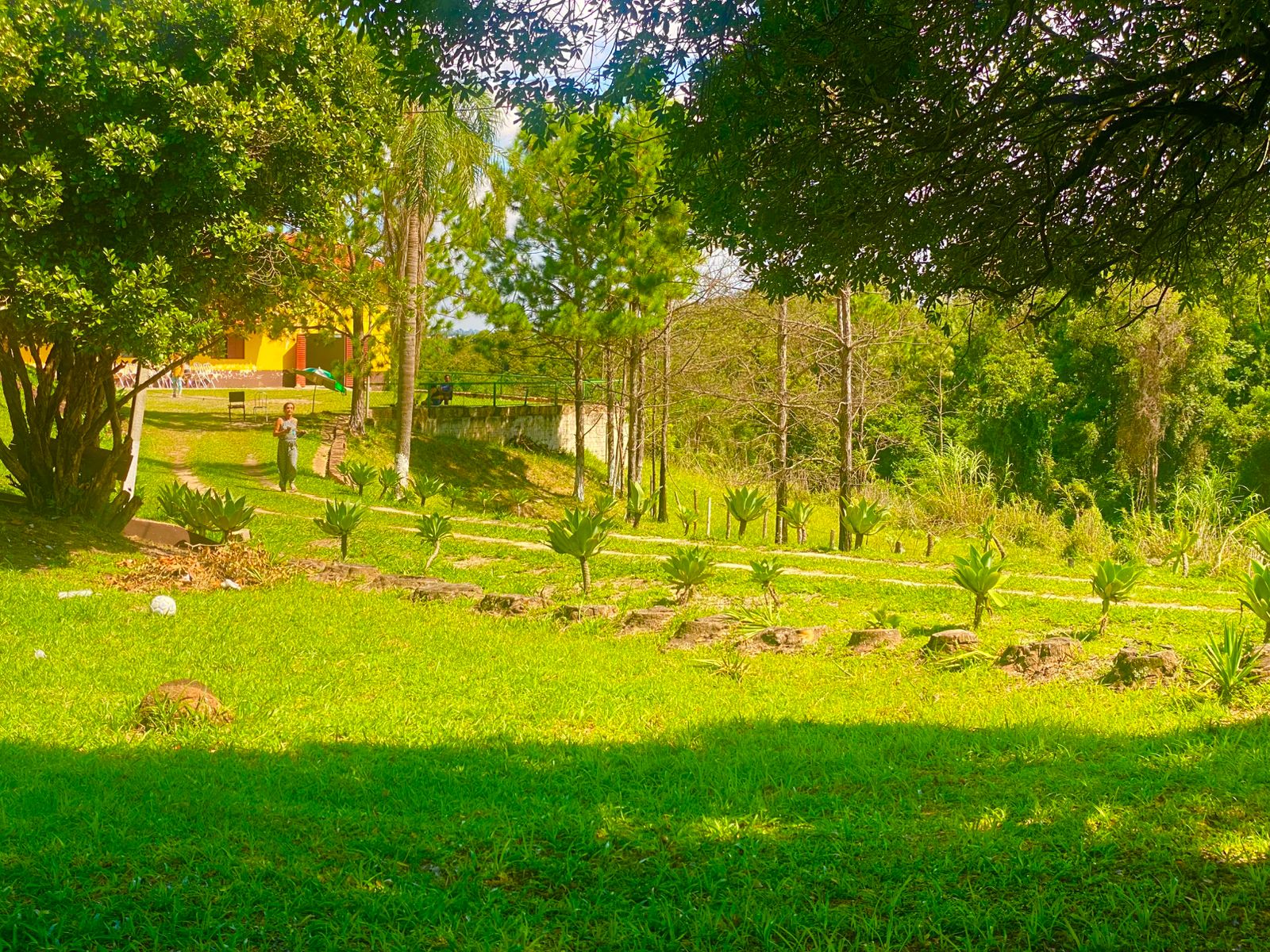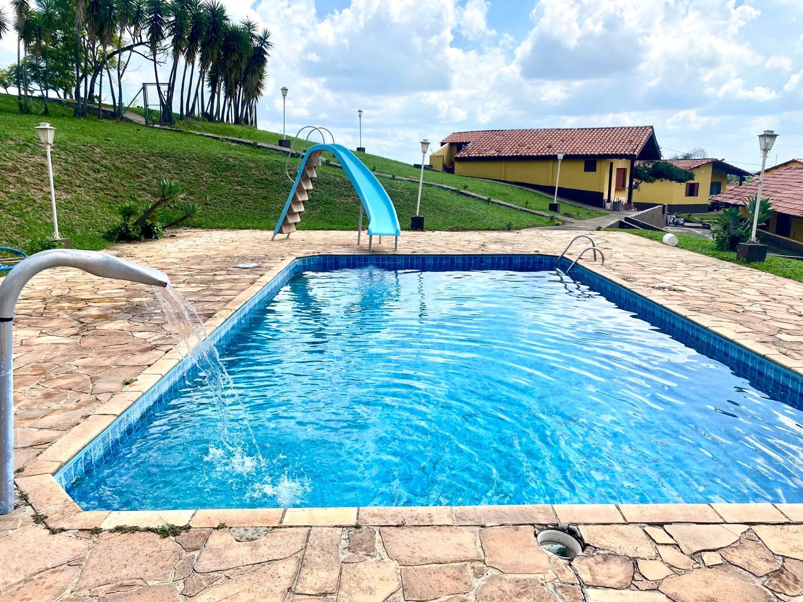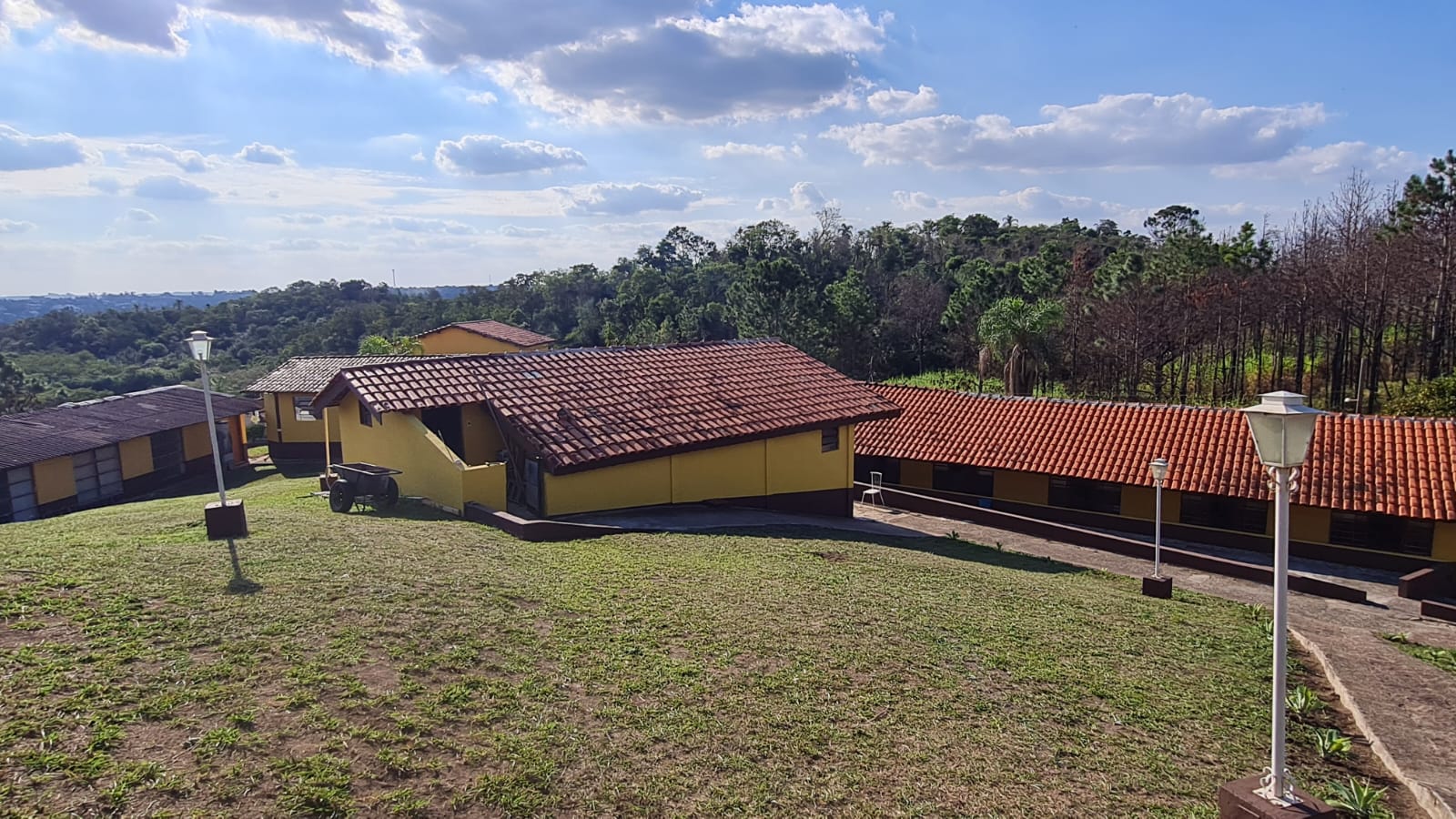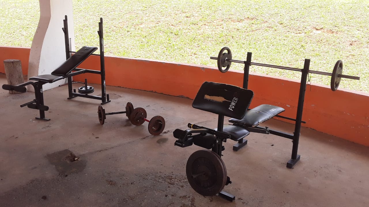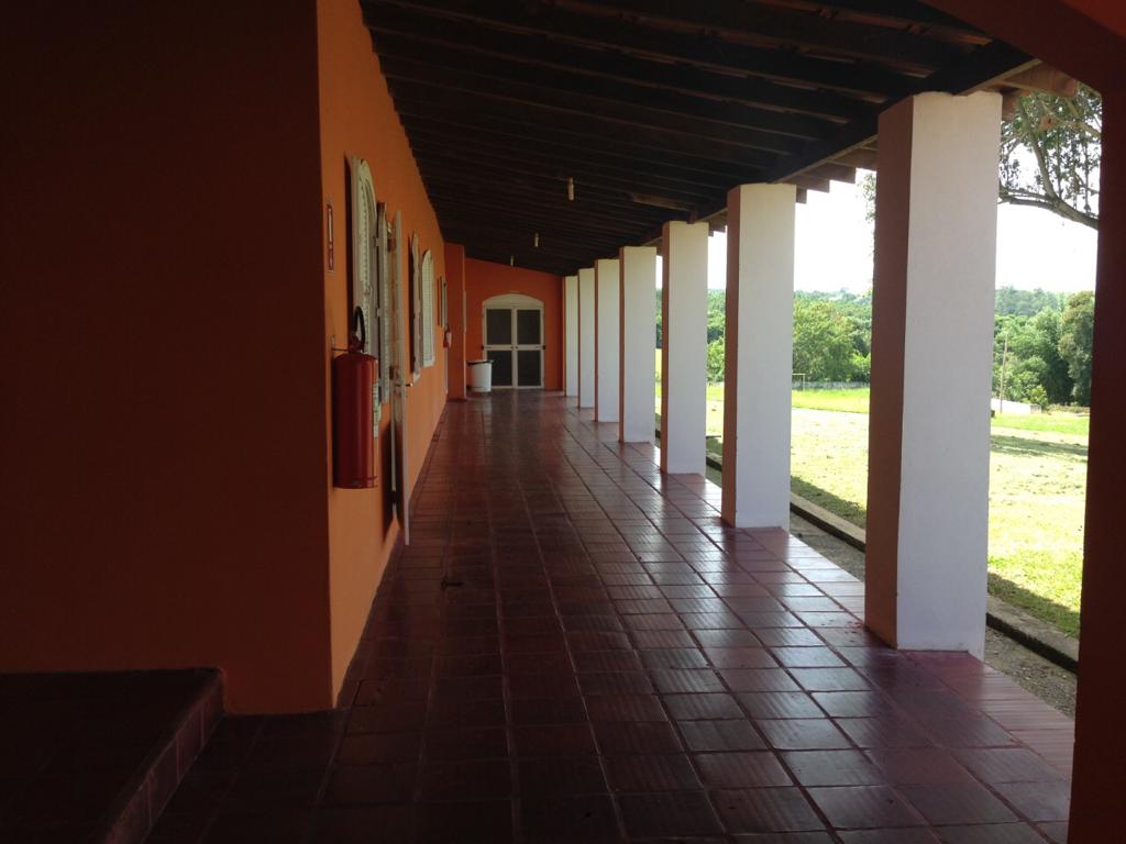 Ambientes equipados com piscina, academia, campo e quadra para esportes, refeitório, além de uma área ampla.